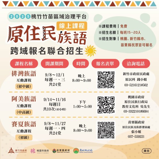 二、 為促進原住民族語學習資源共享與文化傳承,桃園市、新竹縣、新竹市及苗栗縣等四縣市政府攜手合作,整合原住民族語線上課程資源,推出「原住民族語線上課程聯合招生」計畫,開放四地民眾自由報名選修,突破區域與交通限制,實現族語學習「零距離」,有效提升學習便利性與參與率,促進資源共享並推動文化傳承。
