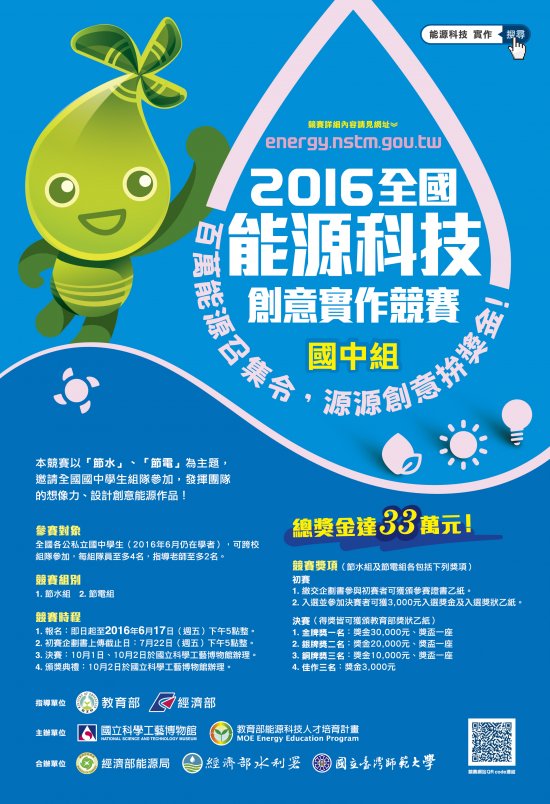 一、 | 本競賽係由教育部及經濟部共同指導,本館與教育部能源科技人才培育計畫辦公室共同主辦,以「節水」及「節電」等「生活節能」為主題,邀請全國國中學生組隊參加,希望發揮團隊想像力提出具體的創意設計作品,在生活中確實展開珍惜能源、愛護環境的行動。 |